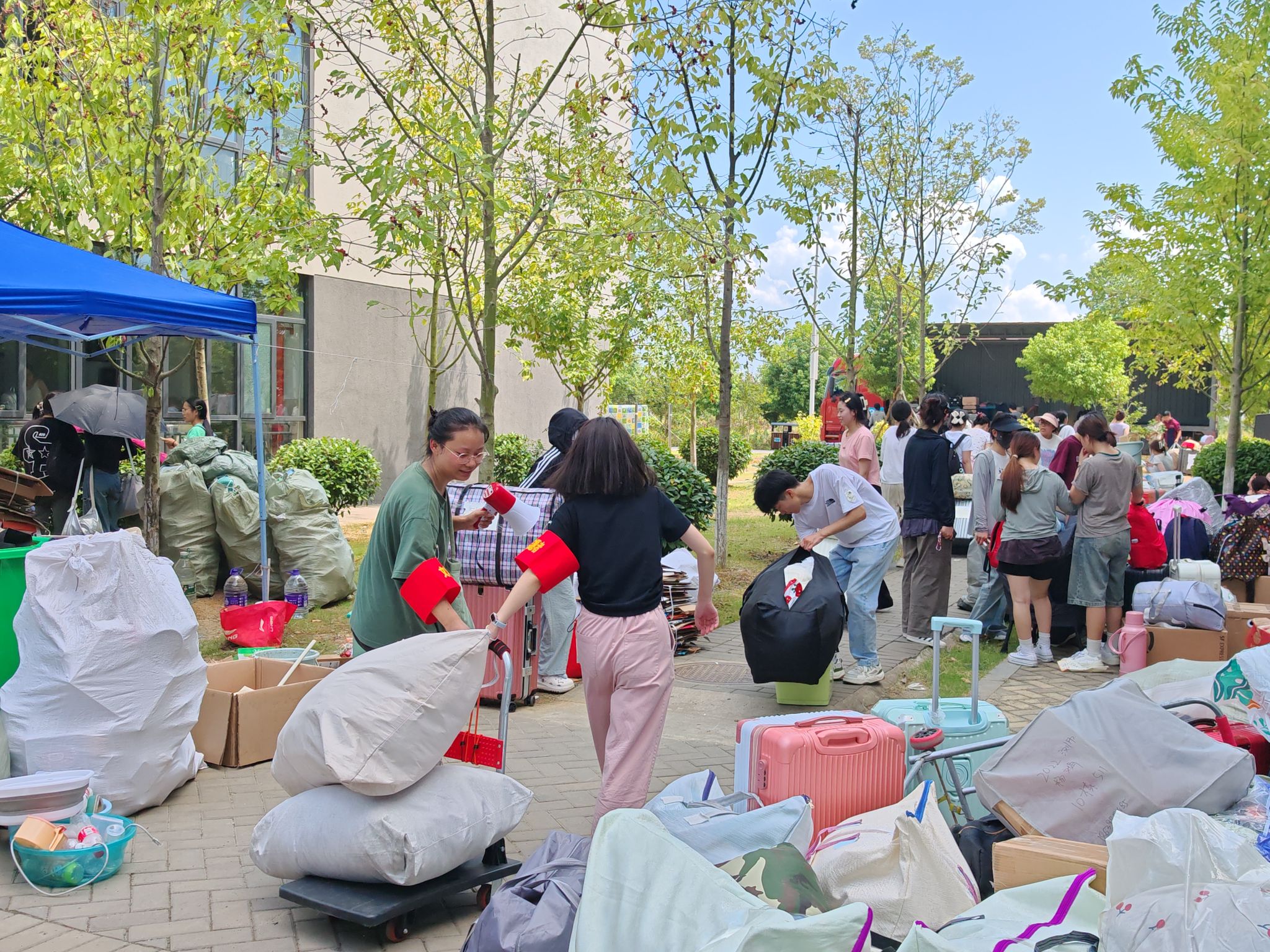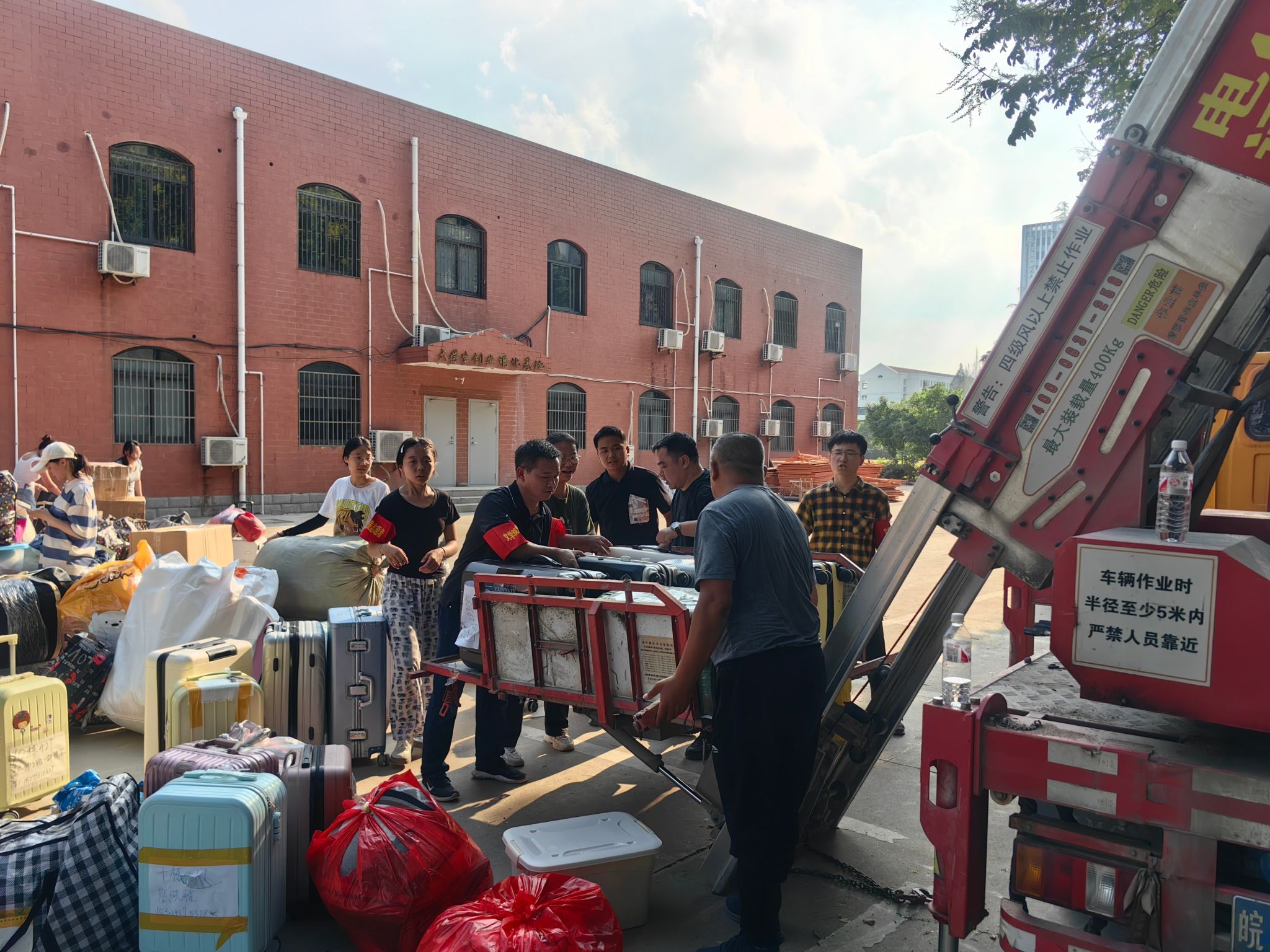 党员先锋、员工干部、青年志愿者冲锋在前,主动接待引导、搬运行李,红色志愿袖章成为搬运现场一道亮丽的风景线;各班级员工互帮互助、携手行动,展现了青年人的蓬勃朝气和友爱精神。两校区搬迁工作秩序井然。为减轻员工上下楼行李搬运压力,学院联系了可升降作业的工程车辆,负责搬运行李下楼、上楼,获得了员工的一致好评。