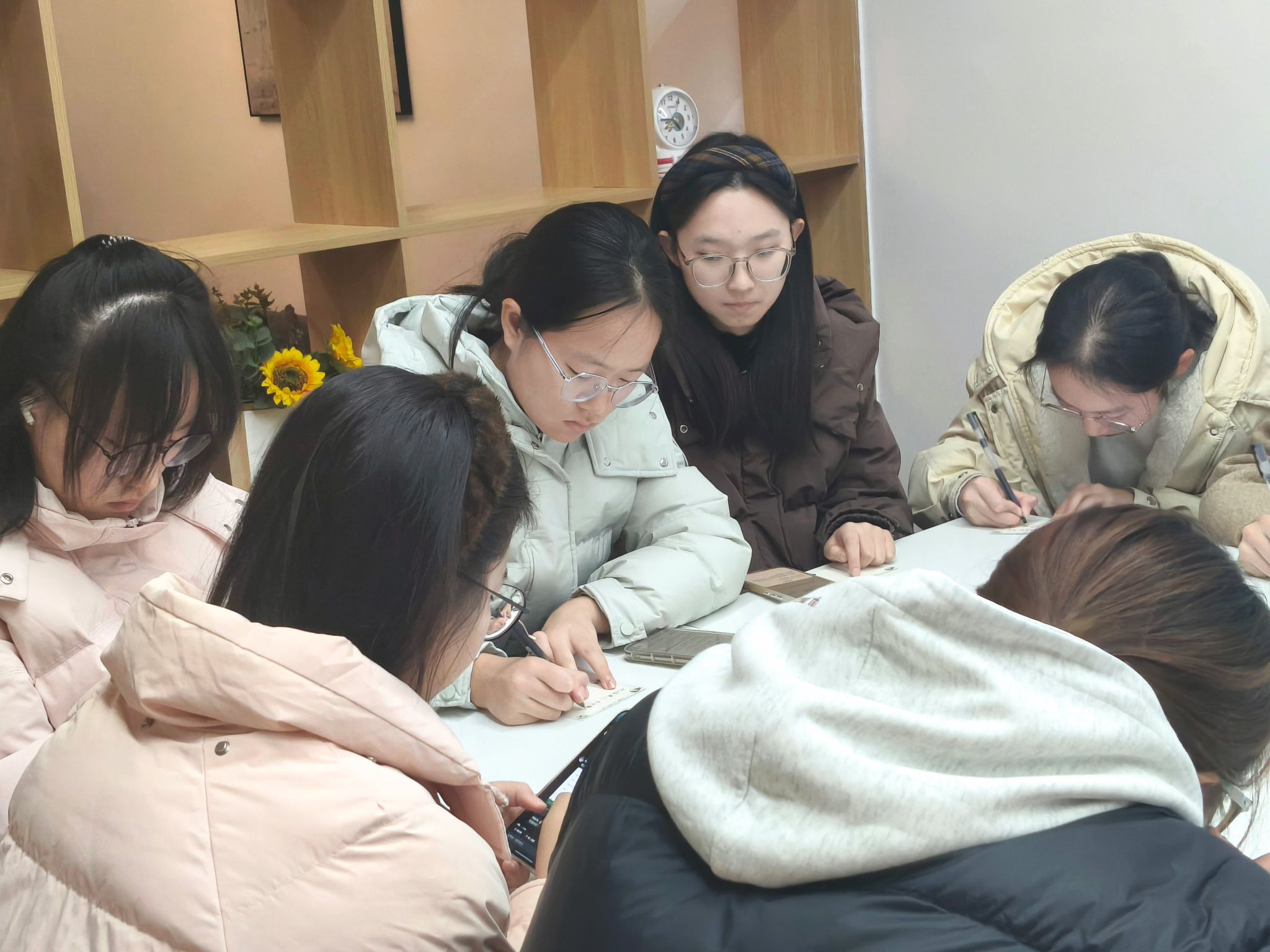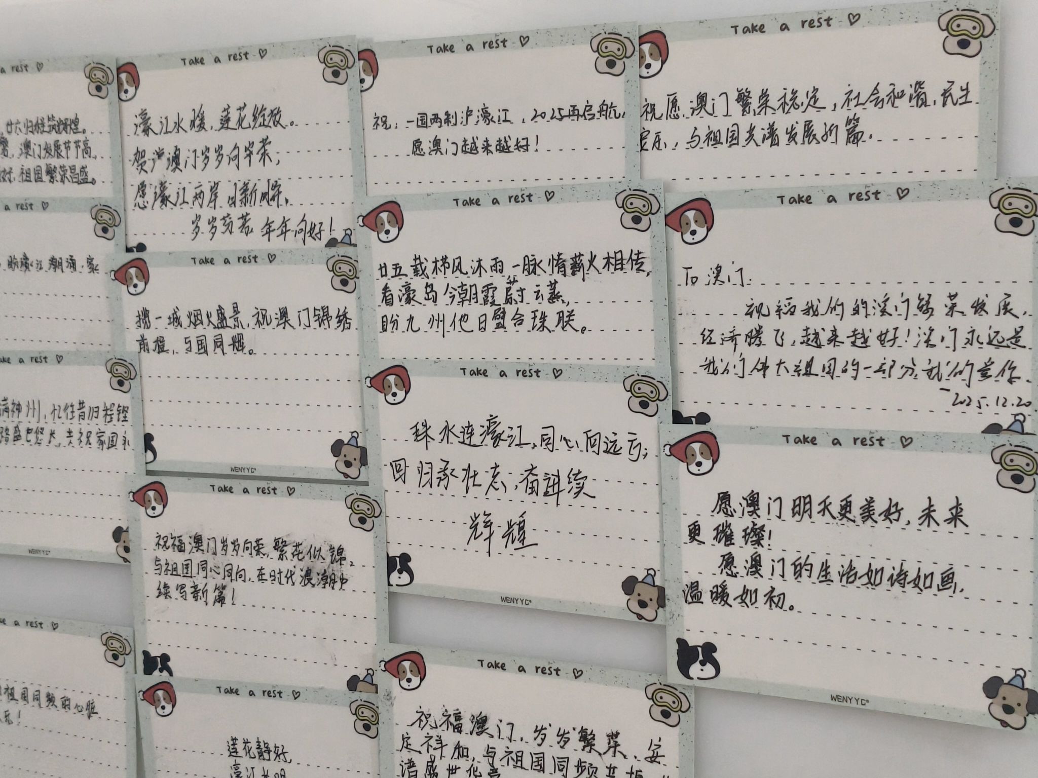 在温馨而庄重的互动环节中,同学们将观影后的思考与感动转化为笔墨间的祝福。他们在统一设计的纪念卡片上认真书写下一行行真挚话语:“愿澳门与祖国同心同行,明天更灿烂”“廿六载莲香依旧,新时代共续华章”“以文载道,以情暖城,祝福澳门永远繁荣”……一字一句,既有对澳门未来的美好憧憬,也饱含着对祖国统一的坚定信念。书写完成后,全体参与者手持寄语卡片合影留念,并齐声诵读活动主题“文载初心,情暖澳门”,将现场氛围推向高潮。这些满载心意的卡片被精心陈列于社区“同心寄语墙”,成为一道凝聚情感、浸润心灵的风景线。